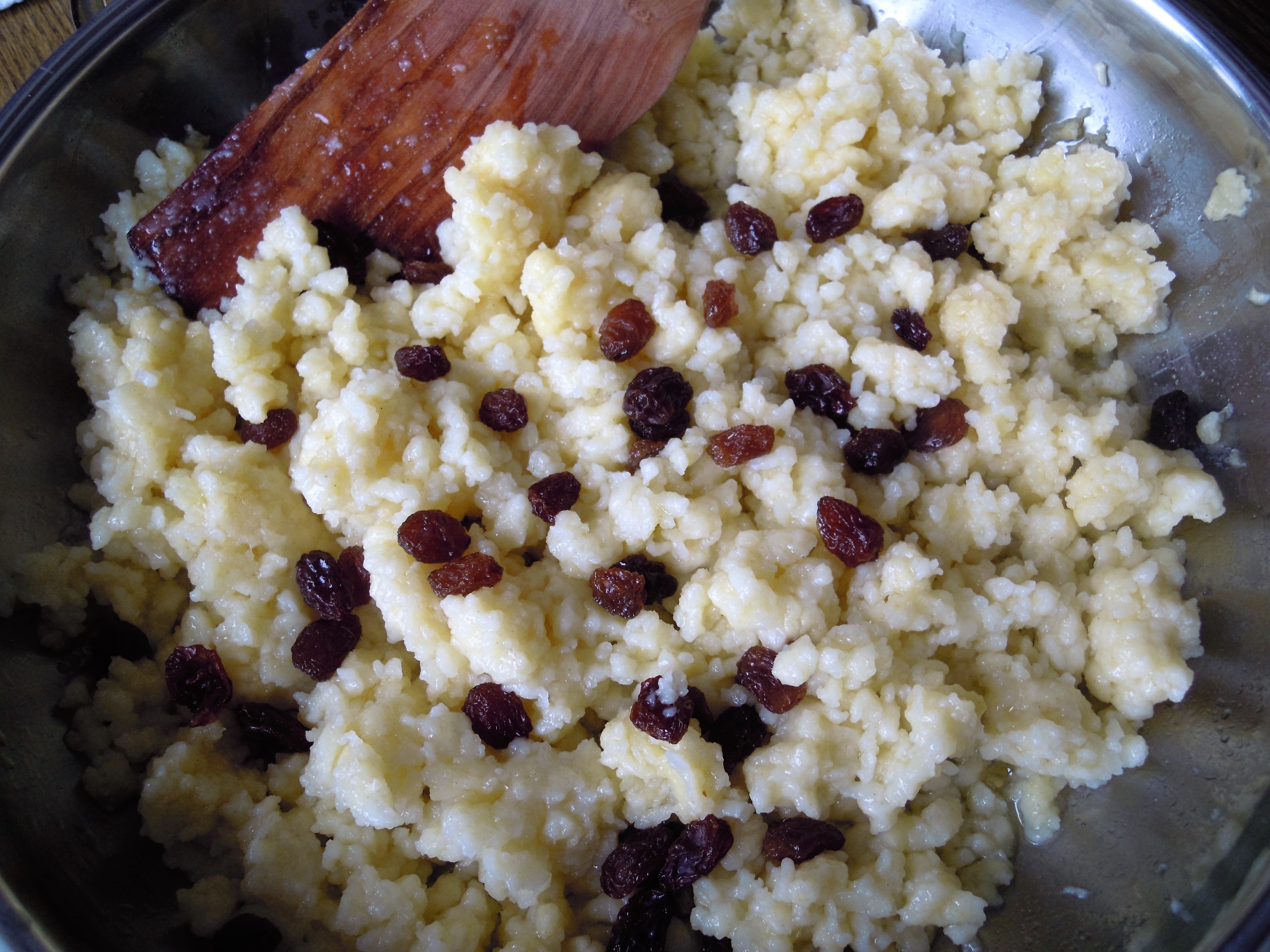 Die Reibgersteln einkochen, 1 EL Rosinen dazugeben, gut umrühren. 1 EL Butterschmalz darübergeben und mit geschlossenem Deckel 45 im Rohr ausdünsten lassen (175 °C).
