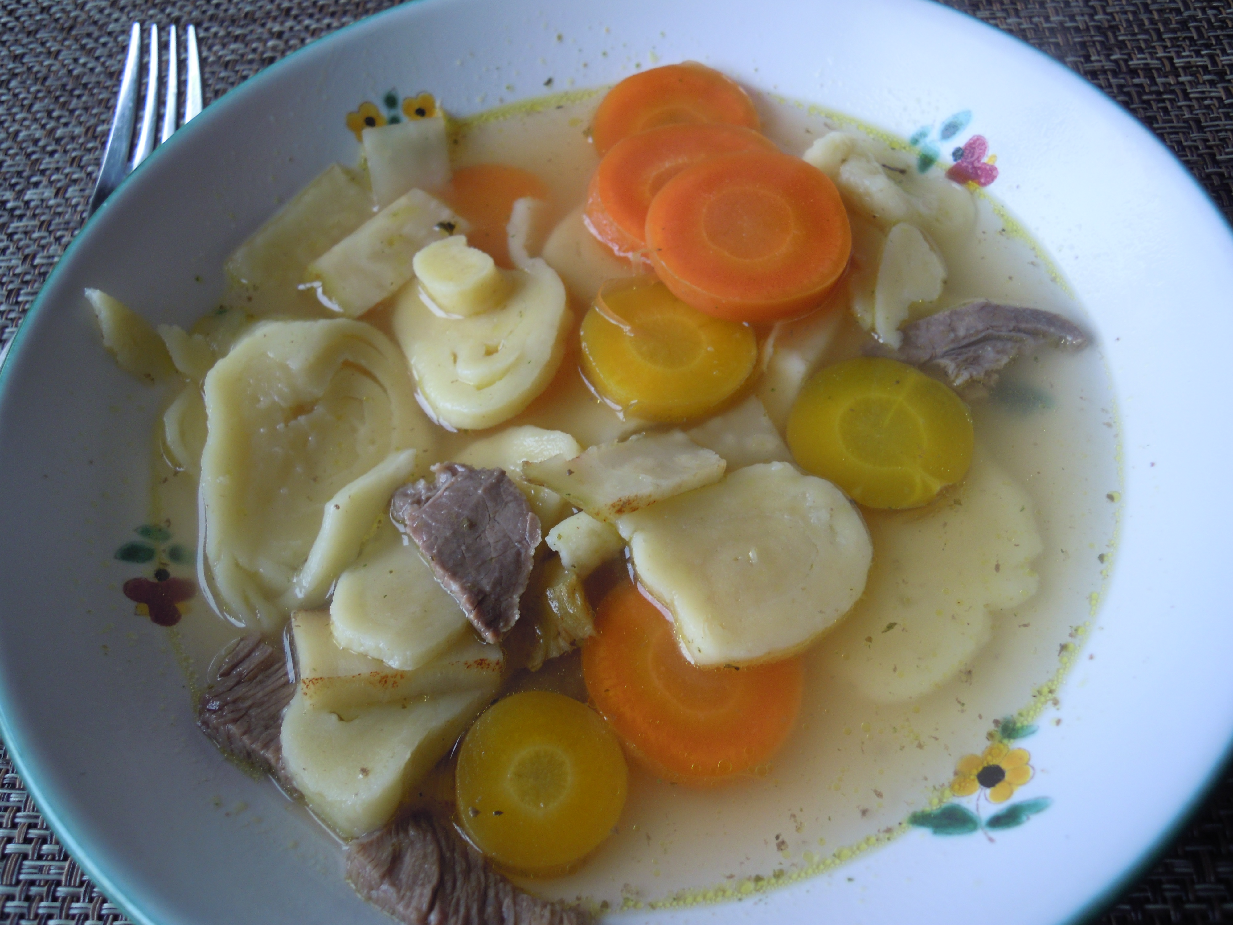 Kurz vor dem Servieren die geschnittenen Strugglnudel und Rindfleisch dazugeben.