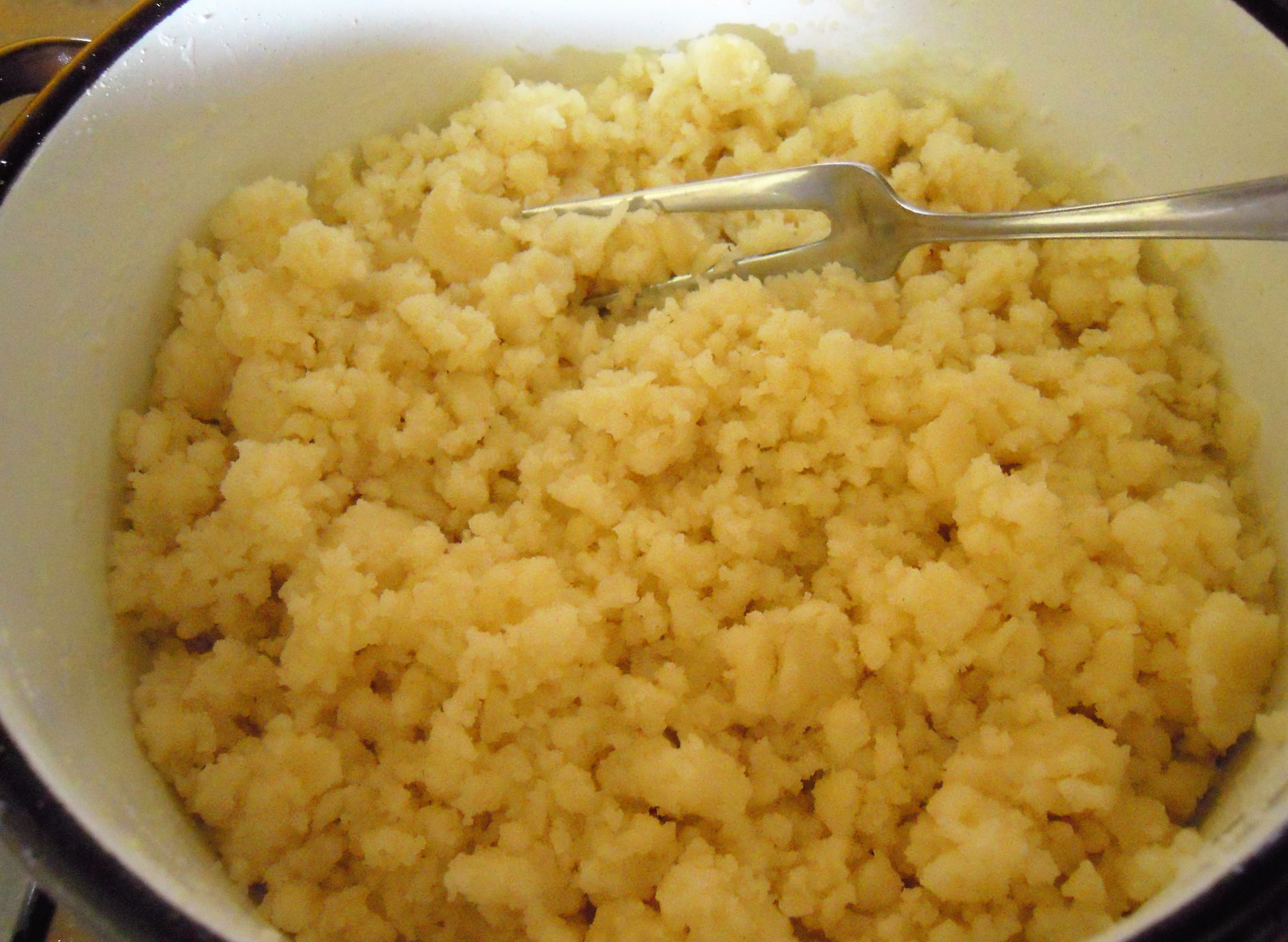 (Butter-)Schmalz darübergeben und den Sterz mit einer zweizinkigen Gabel zergabeln. Nach Geschmack Grammeln dazugeben.